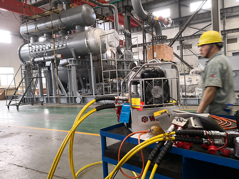 ?根據(jù)開山集團衢州制造基地負責人介紹,他們有一批大型設(shè)備為新能源新型壓力設(shè)備,螺栓為M42高壓高強度螺栓,在預(yù)緊大型加壓設(shè)備法蘭面時,常規(guī)人力預(yù)緊已然無法滿足在壓力測試中泄漏的問題。經(jīng)過了解和對比,深知雷恩WREN液壓扳手在扭矩精度、加工精度、核心部件以及售后服務(wù)上都很突出,而且是20多年的老牌子,值得信賴。于是,該項目主管選擇了雷恩WREN尋找技術(shù)解決方案。