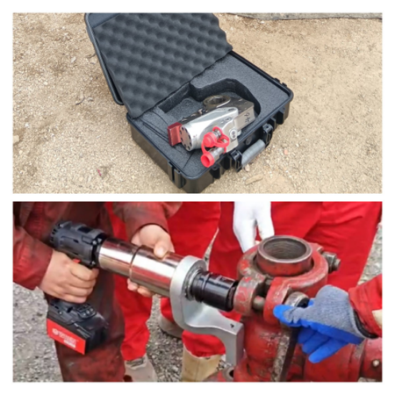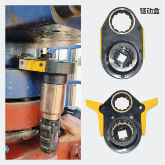 我司工程師與客戶交流得知,現(xiàn)場(chǎng)工況為石油開采設(shè)備螺栓緊固,螺栓尺寸為M46。該處工況安裝,一直是比較拖效率的安裝工位,針對(duì)這個(gè)情況,為提升客戶工作效率、減輕工作強(qiáng)度,這次攜帶的中空型液壓扭矩扳手,工作頭直接作用于螺栓,扭矩更加精確,整體重量輕,使用更加方便。扁平式設(shè)計(jì)使得寬度變小,適合狹小空間作業(yè);另外,攜帶的電動(dòng)扭矩扳手更加方便了,只需兩塊可拆卸電池交換使用,就能連續(xù)工作,而且重量輕,減輕了工作強(qiáng)度。對(duì)于這種高度不夠的工況,我們加上一個(gè)驅(qū)動(dòng)盒就能完美解決,省時(shí)又省力!