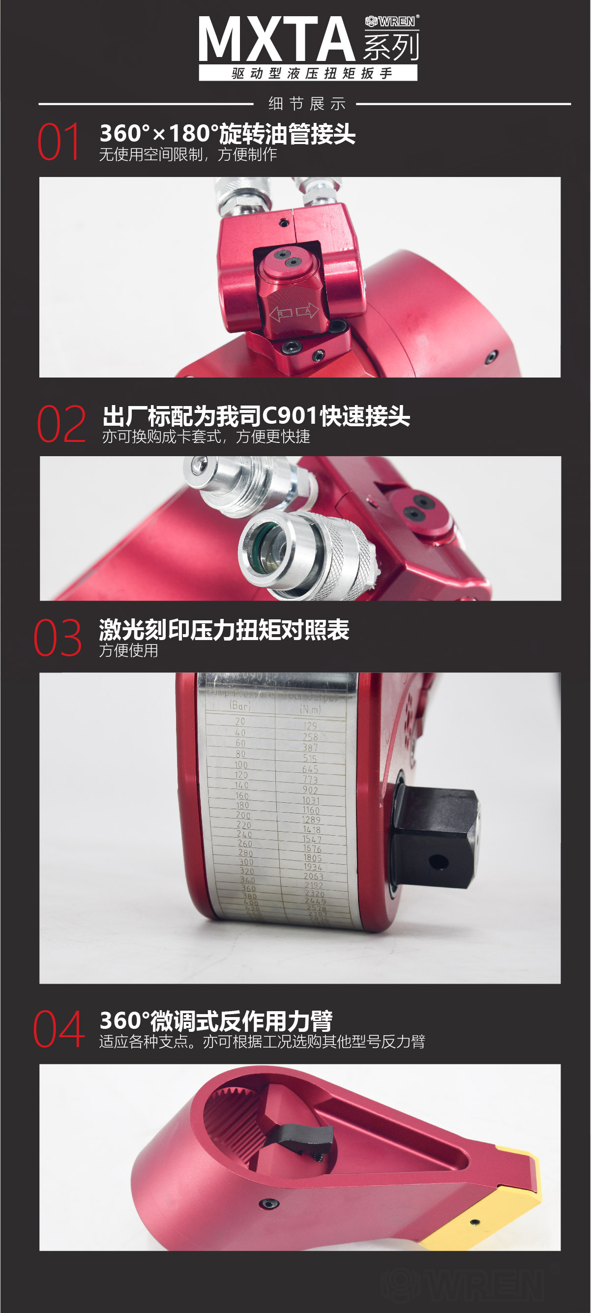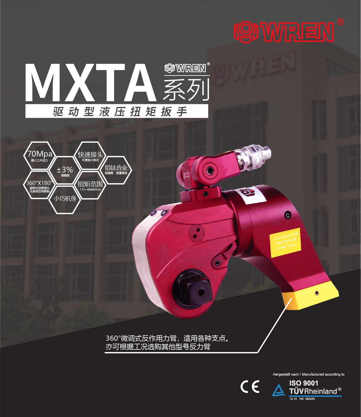 MXTA系列是WREN公司主力投放國(guó)內(nèi)市場(chǎng)的一款專業(yè)級(jí)別的液壓扭矩扳手。其鋁鈦合金的航空材料的液壓扭矩扳手重量輕,強(qiáng)度高,值得注意的是MXTA系列液壓扭矩扳手擁有從112N.m-48666N.m共8個(gè)標(biāo)準(zhǔn)型號(hào),可以出色完成螺栓的鎖緊以及拆卸工作。WREN品牌提供全球售后服務(wù),擁有完整的配套供應(yīng)能力,通過(guò)德國(guó)萊茵TUV認(rèn)證及歐盟CE認(rèn)證。