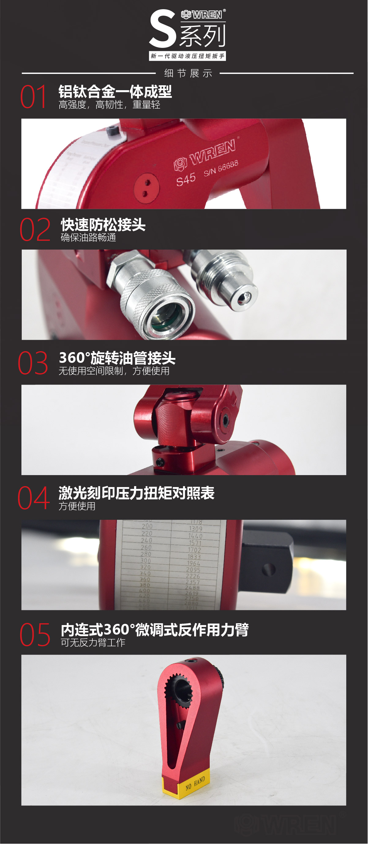 S系列驅(qū)動(dòng)型液壓扭矩扳手是融合了高科技的新一代產(chǎn)品。鋁鈦合金的航空材料液壓扳手重量輕,強(qiáng)度高,小巧的機(jī)身可以幫您完成重要的任務(wù)。S系列驅(qū)動(dòng)型液壓扭矩扳手擁有從172N.m-36992N.m共5個(gè)標(biāo)準(zhǔn)型號(hào),可以出色的完成螺栓的預(yù)緊以及拆松。WREN品牌提供全球售后服務(wù),擁有完全的配套供應(yīng)能力,通過(guò)德國(guó)萊茵TUV認(rèn)證以及歐盟CE認(rèn)證。