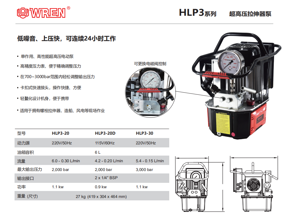 - 單作用、高性能超高壓電動(dòng)泵,性能穩(wěn)定 - 適用于擁有螺栓拉伸器,造船、風(fēng)電等現(xiàn)場(chǎng)作業(yè) - 高精度壓力表,便于精確調(diào)整壓力 - 在700~3000Bar范圍內(nèi)輕松調(diào)整輸出壓力 - 卡扣式快速接頭,操作快捷、方便 - 輕量化設(shè)計(jì)機(jī)身,便于攜帶