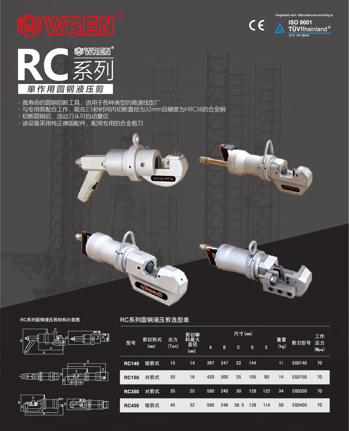 ? ? ? ? WREN液壓剪可以切割圓形、四方、六角和二次交叉的鋼絲。由于其小巧,高效的特點,我們的液壓剪廣泛應(yīng)用于鋼絲生產(chǎn)行業(yè)。SK用于標(biāo)準(zhǔn)切割,標(biāo)準(zhǔn)的WREN液壓剪含SK切割片,可以切割直徑最大為28mm的材料,特殊型號的液壓剪含SK系列刀片可以切割的最大直徑為80mm。