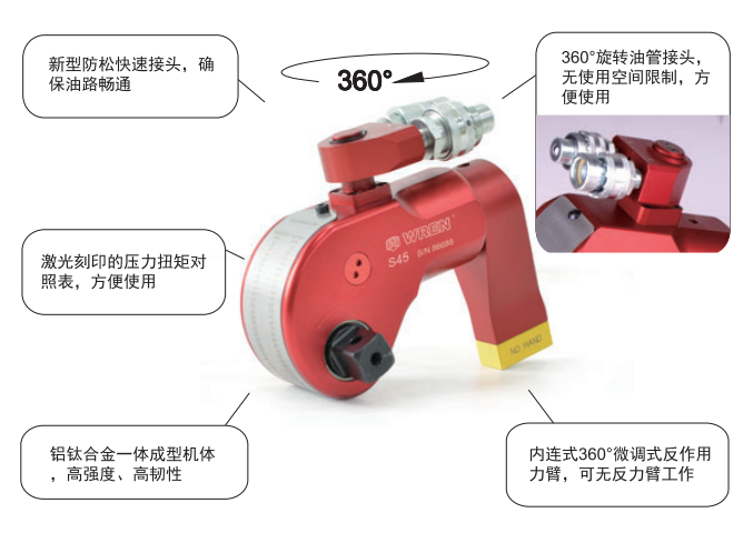 WREN雷恩S系列驅(qū)動(dòng)型液壓扭矩扳手主要以鋁鈦合金的航空材料,液壓扳手重量輕,強(qiáng)度高,小巧的機(jī)身可以幫您完成重要的任務(wù)。S系列驅(qū)動(dòng)型液壓扳手扭矩最大的36992N.m,可以出色完成每一個(gè)螺栓的預(yù)緊以及柴松工況。