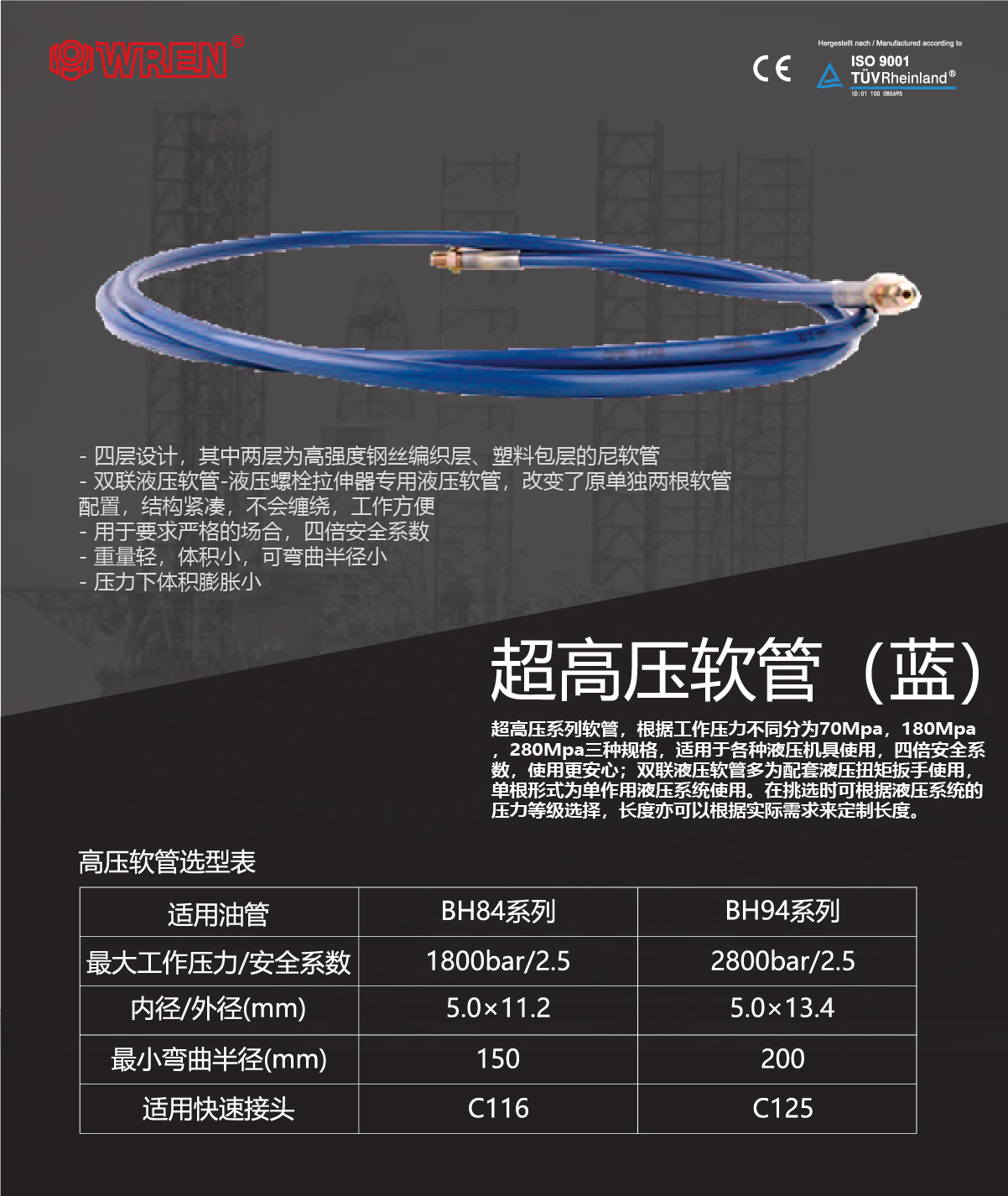 - 四層設(shè)計(jì),其中兩層為高強(qiáng)度鋼絲編織層、塑料包層的尼軟管