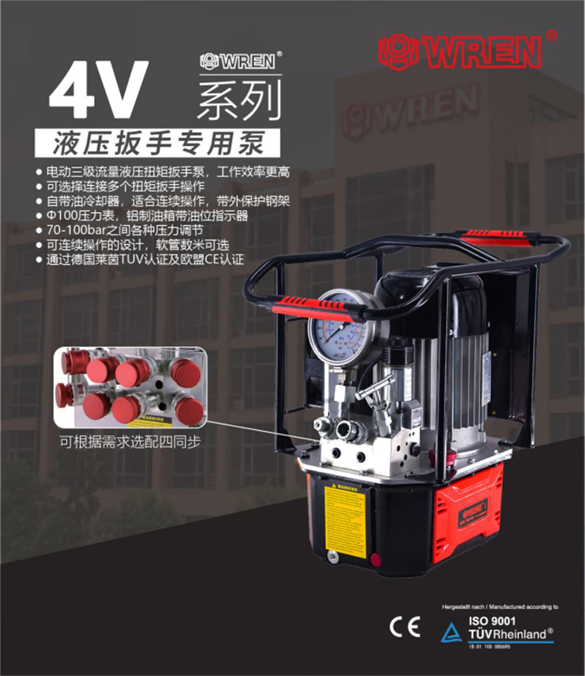4V系列為液壓扳手專用泵,采用集成方式組裝,由動力單元、電氣電元、控制裝置等組成第一種獨立完整的液壓裝置,具有流量大、體積小、重量輕、結(jié)構(gòu)簡單、操作方便、工作壓力高等特點,并且高壓出口(A口)出油壓力可在70~700bar間任意調(diào)節(jié)。