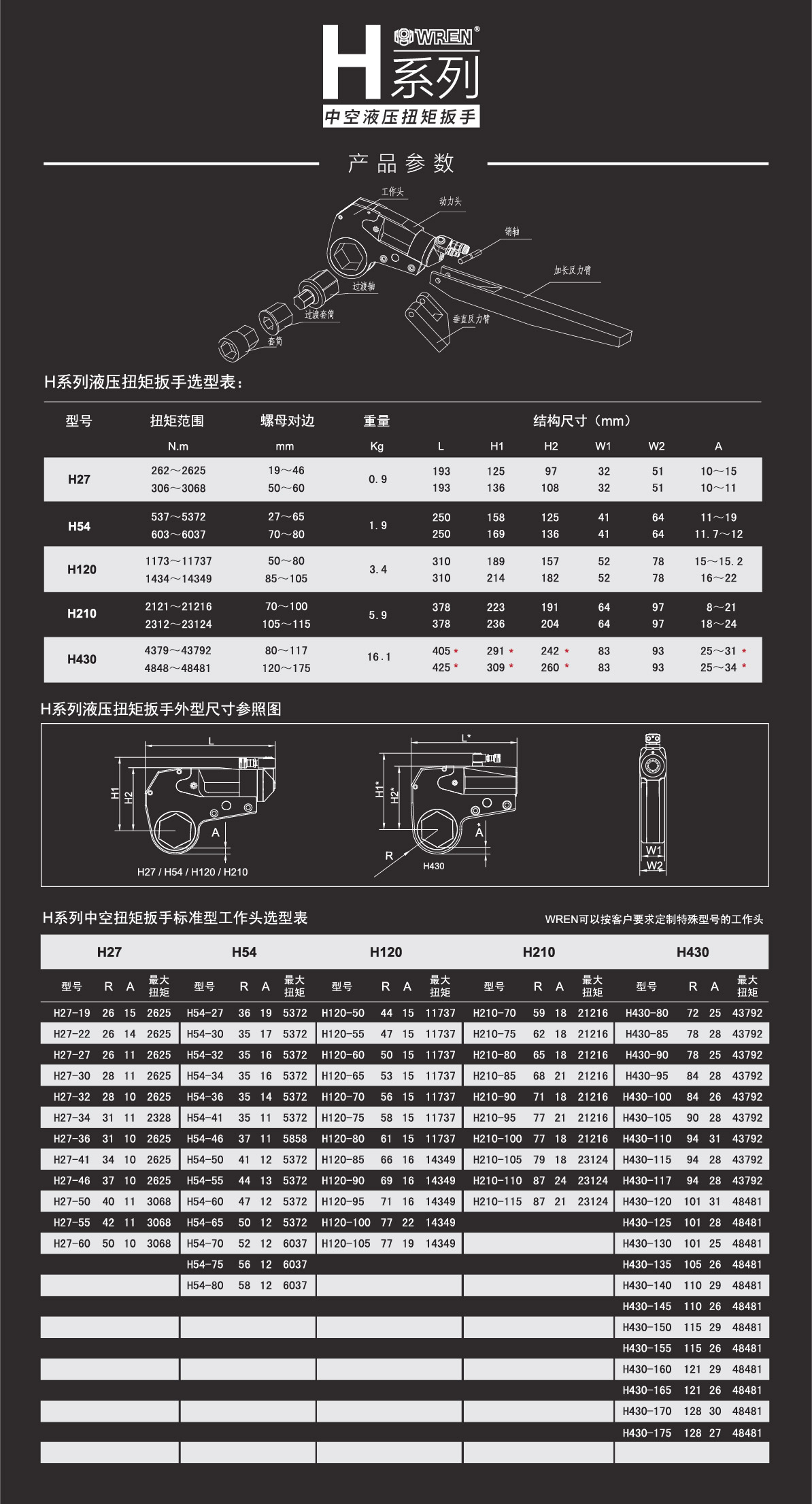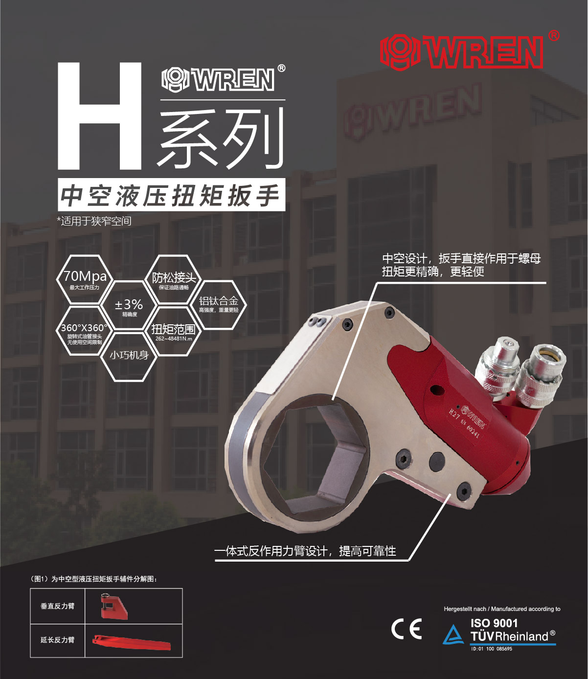 H系列中空型液壓扭矩扳手是專門為狹窄空間設計的。它可以以一臺動力頭配備不同規(guī)格的工作頭來適應不同的螺栓工況,工作頭可以在沒有任何工具輔助的情況下隨意更換,而且即學即會,簡單的更換操作可以在工作中節(jié)省大量的時間,以提高工作效率。鋁鈦合金的航空材料使其擁有輕便的機身,適應超高強度的工作。WREN品牌提供全球售后服務,擁有完整的配套供應能力,通過德國萊茵TUV認證及歐盟CE認證。