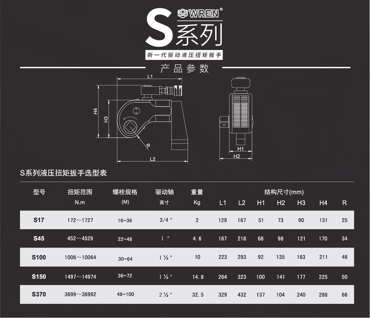 S系列驅(qū)動(dòng)型液壓扭矩扳手是融合了高科技的新一代產(chǎn)品。鋁鈦合金的航空材料液壓扳手重量輕,強(qiáng)度高,小巧的機(jī)身可以幫您完成重要的任務(wù)。S系列驅(qū)動(dòng)型液壓扭矩扳手擁有從172N.m-36992N.m共5個(gè)標(biāo)準(zhǔn)型號(hào),可以出色的完成螺栓的預(yù)緊以及拆松。WREN品牌提供全球售后服務(wù),擁有完全的配套供應(yīng)能力,通過(guò)德國(guó)萊茵TUV認(rèn)證以及歐盟CE認(rèn)證。